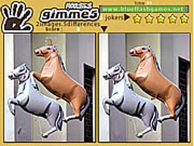 Gimme 5 Horses is a spot‑the‑difference puzzle where you compare two cute horse‑themed images and search for five changes before the timer runs out. With one minute per round and five jokers available, the game offers a relaxing yet engaging challenge. Its simple point‑and‑click gameplay makes it perfect for quick sessions and for players who enjoy observation‑based puzzles.