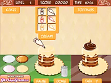 Anda harus membuat kue persis seperti pada gambar yang ditampilkan di sebelah kanan. Klik piring yang benar, lalu pilih kue yang sesuai dari menu drop-down. Kemudian pilih krim dan isian yang diperlukan dari menu drop-down. Setelah selesai, klik tombol "Selesai". Untuk menyelesaikan level, hias jumlah kue yang tertera di bilah tugas Anda sebelum batas waktu berakhir.