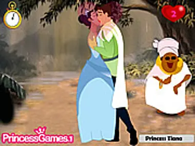 Princess Tiana kissing the prince. Make sure she don't get caught.