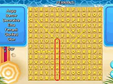 Find all words hidden on the beach. Drag on the grid to select a word and try to find all.