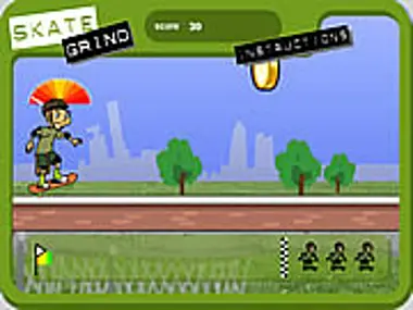 Skate along the course and jump to collect the gold coins. These will give you points. Be careful, there are cones you have to jump and benches you have to grind along. On the benches, be careful to keep your balance. Fall and start again.