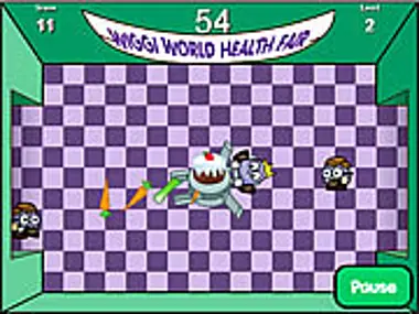 Shoot the veggies at the incoming school kids. Starts off boring, but more kids start coming at you.