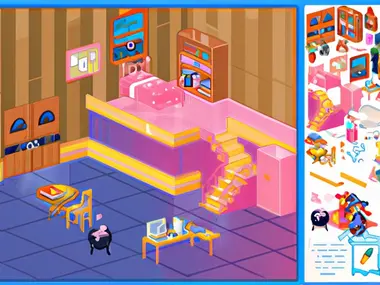Ayo masuk! Kita di rumah penyihir! Jelajahi rumah ini dan hias sesukamu. Tahu kan, kuali itu wajib ada di sini! Jangan lupa letakkan beberapa buku tua dan banyak botol ramuan!